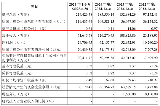 在2022年、2023年、2024年和2025年前6个月的营收分别为442.62 万元、5809.37 万元、5370.42 万元及 1123.58 万元;占公司总营收的比例分别为5.36%、9.65%、7.27%和3.64%。