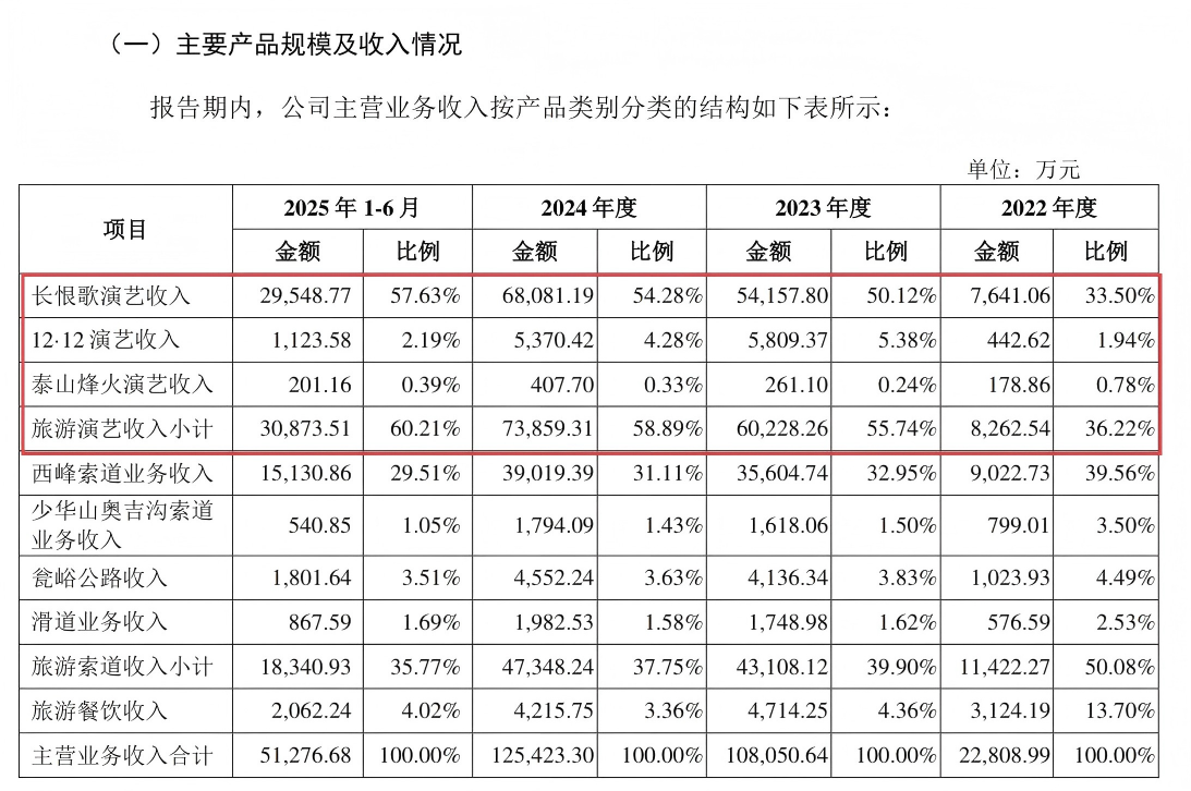2022年、2023年、2024年及2025年1-6月,《长恨歌》演艺收入的营收占比从33.5%提升至57.63%,占比较大;旅游索道的营收占比从50.08%降至35.77%,旅游餐饮的营收占比也有所下滑。