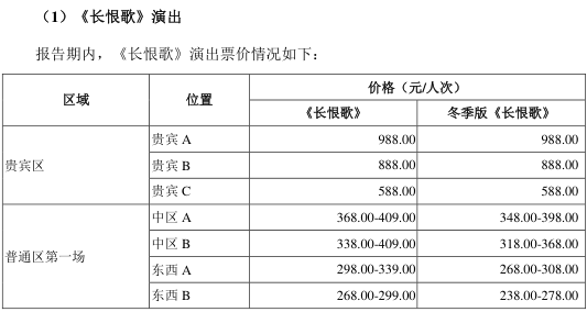 招股书显示,《长恨歌》贵宾区A位置的价格已经接近1000元,普通区第一场的价格也在268元至409元之间。