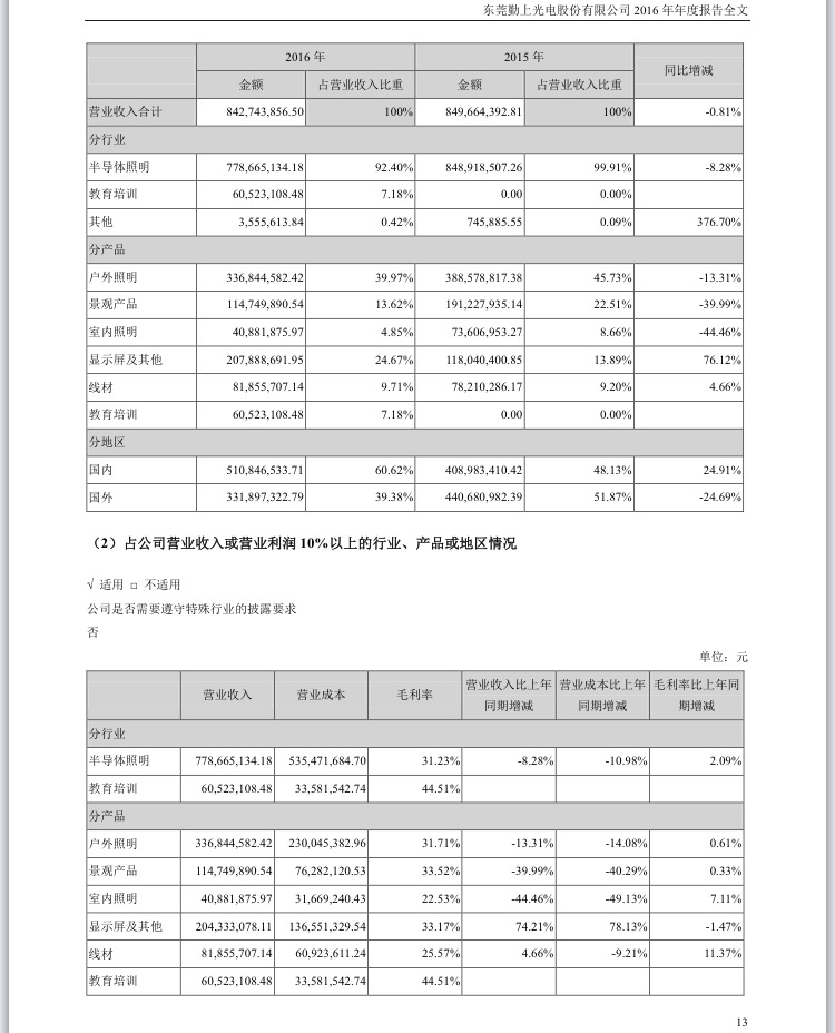 勤上股份成立于1994年,1998年开始涉足LED照明产品的研发和生产,曾屡次中标市政照明工程大单。2011年深交所上市,成为以半导体照明为主营业务的第一股。根据公司2016年年报,2016年勤上股份营收8.43亿元,半导体照明营收达7.79亿元,占营收比高达92.40%。2015年勤上股份营收为8.497亿元,半导体照明营收高达99.91%。