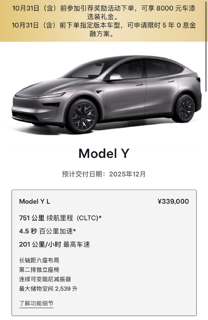 10月17日,特斯拉宣布,Model Y L预计交付日期更新为2025年12月,现在下单,年底前提车。