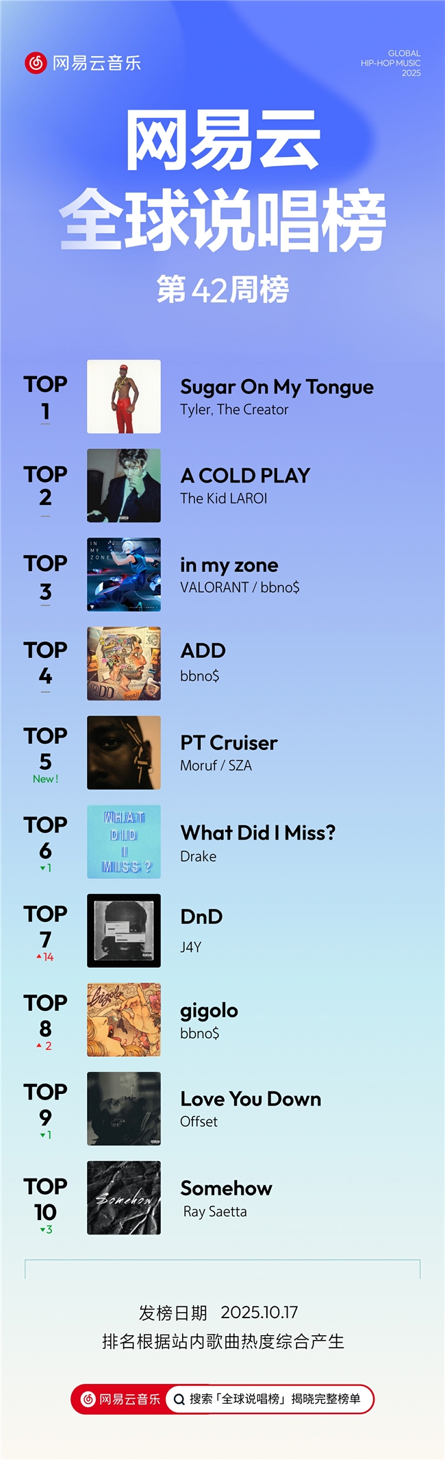 10月17日,网易云音乐发布2025年第42期说唱周榜。中文说唱榜方面,本周多位歌手发布新专辑。艾志恒Asen新专《在雨后醒来》以深度的自我剖析引发共鸣,激起了中文说唱乐迷的广泛讨论,《英雄》空降榜首,《懂不?》《在雨后醒来》《嘻哈脑壳》闯入榜单前十;马思唯发布了前专《乐透人生》的第二篇章《乐透人生GT:即刻入戏》,同样表现亮眼,《马师》《曼巴Flow》《T0》《娱公移山》等多首歌曲上榜,与艾志恒Asen合作的《Hotel Lobby》位居榜单第八位。此外,徐明浩GALI《Star Crossing Night》依旧强势,暂列第二;SASIOVERLXRD《唤水剑》《天生痛苦》持续发酵,稳居前十。