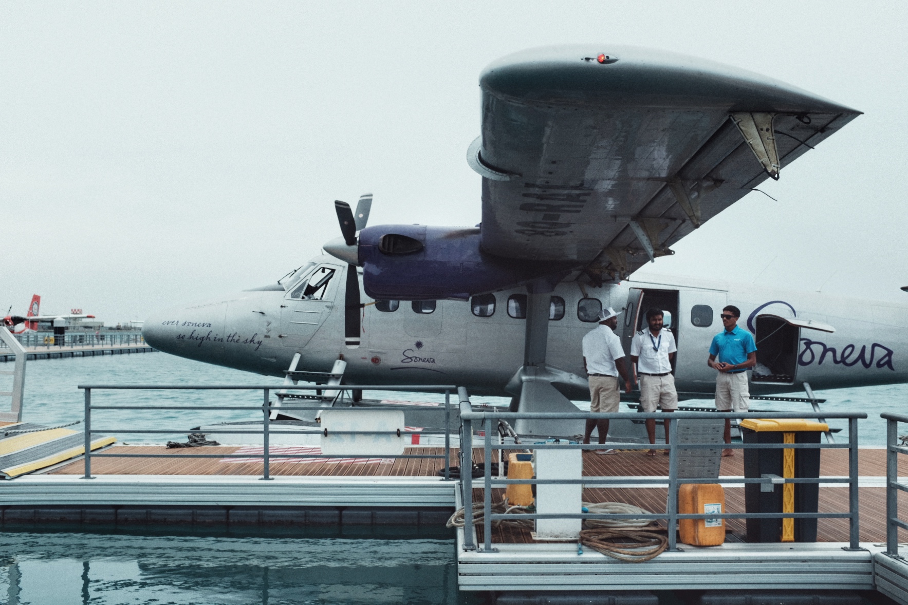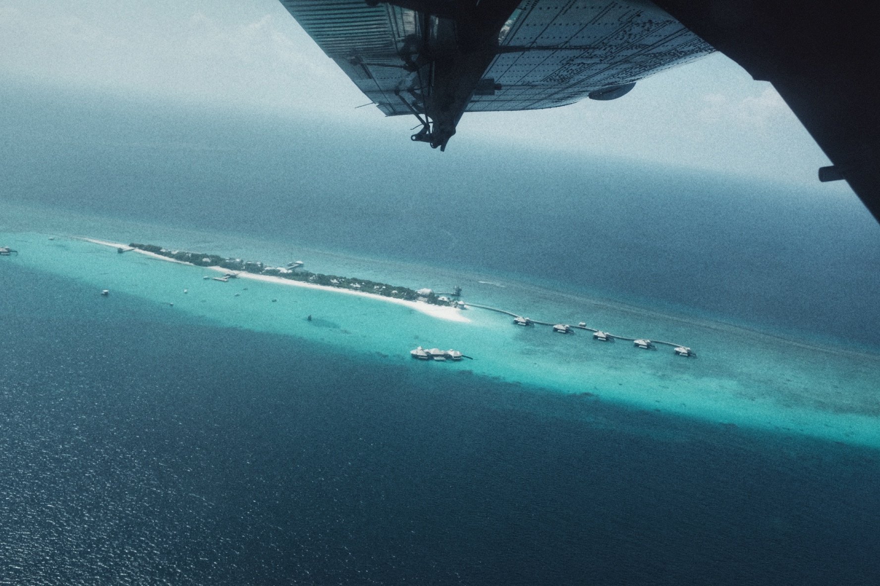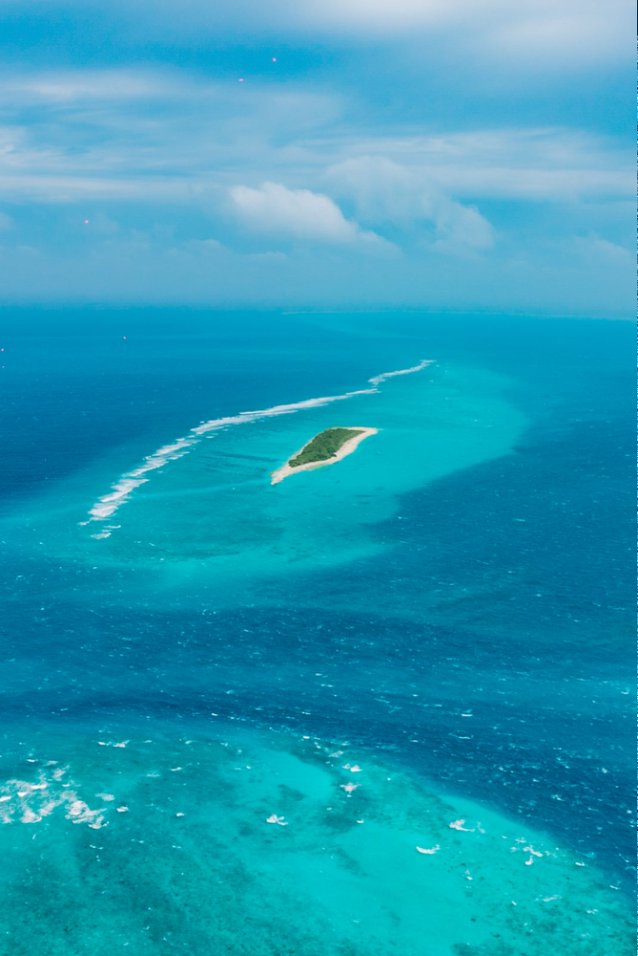 北马累环礁外,水飞已经飞了接近一个小时,刚送完一批到索尼娃芙西(Soneva Fushi)的客人。我们继续前行,是这班水飞下个目的地唯一的客人。从Soneva Fushi出发一路向北,最终经过一个半小时的飞行,飞机降落在一片蔚蓝的泄湖中央,此次体验的酒店就在不远处的小岛上:索尼娃秘密 Soneva Secret。
