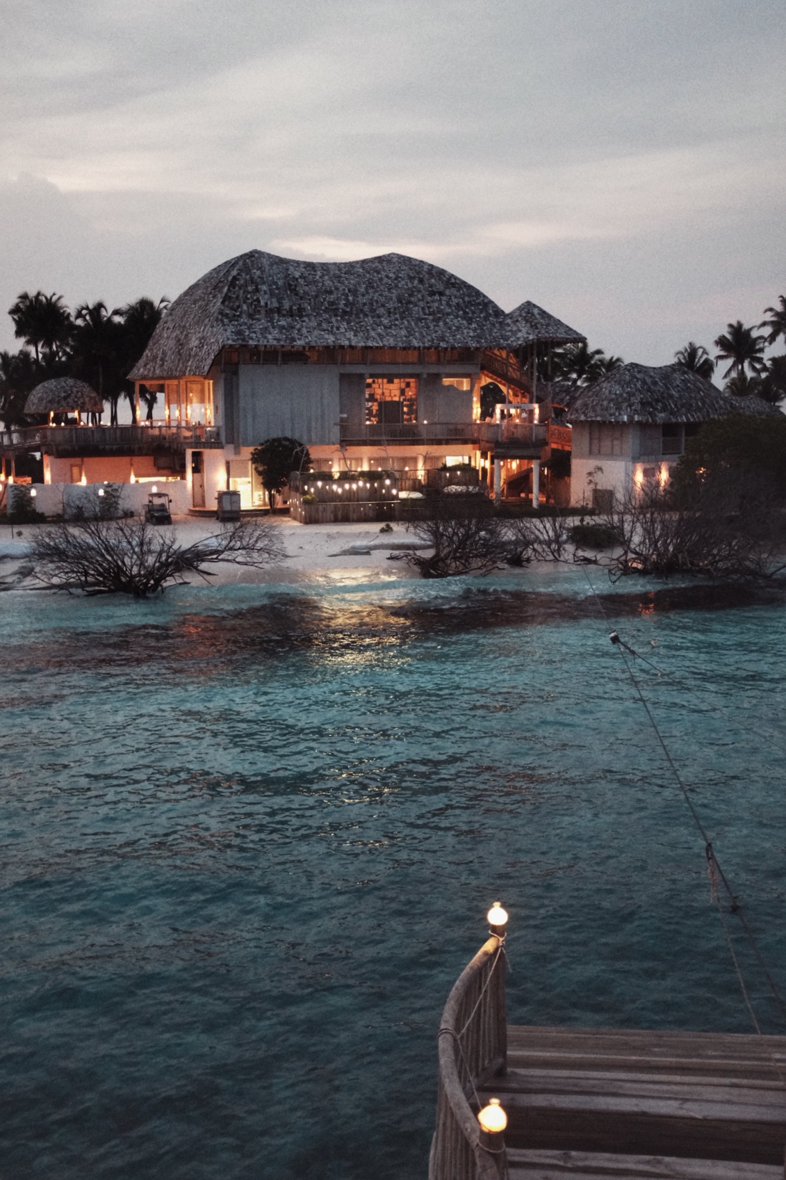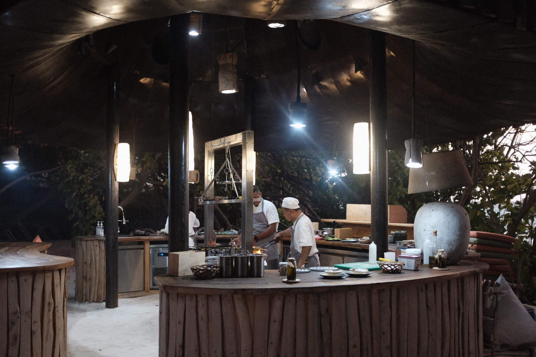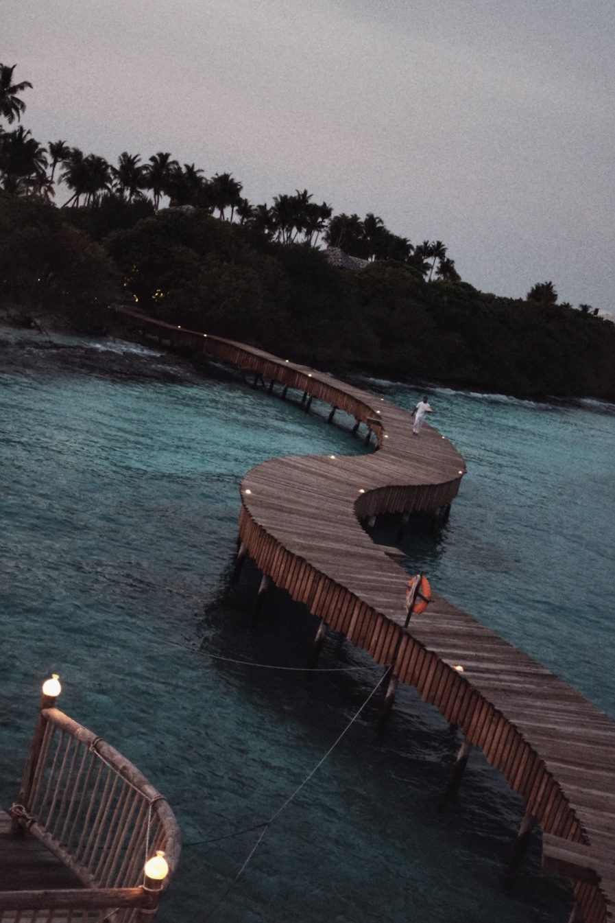 不设招牌与接待大厅,也无需出示护照,行李全程无需过手,登岛的瞬间就像误入一片天然孤岛。全岛面积不大,你甚至可以步行丈量每一寸土地,既能感受到荒野的原始力量,又有Soneva一贯的隐逸审美。管家在快艇上就会建议将鞋履放入布袋,建议你赤足感受沙滩、木质甲板、草地等自然触感,摆脱鞋履的束缚,隐喻“放下都市生活的压力”。入住介绍不超过十分钟,全程坐在面对海洋的长凳上,一个冰镇椰子配上薄荷毛巾,节奏悠然。