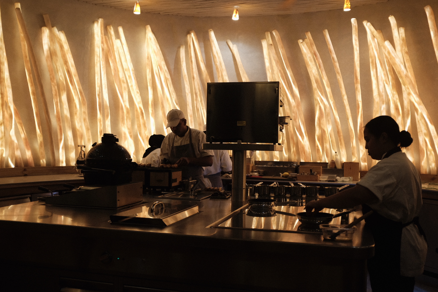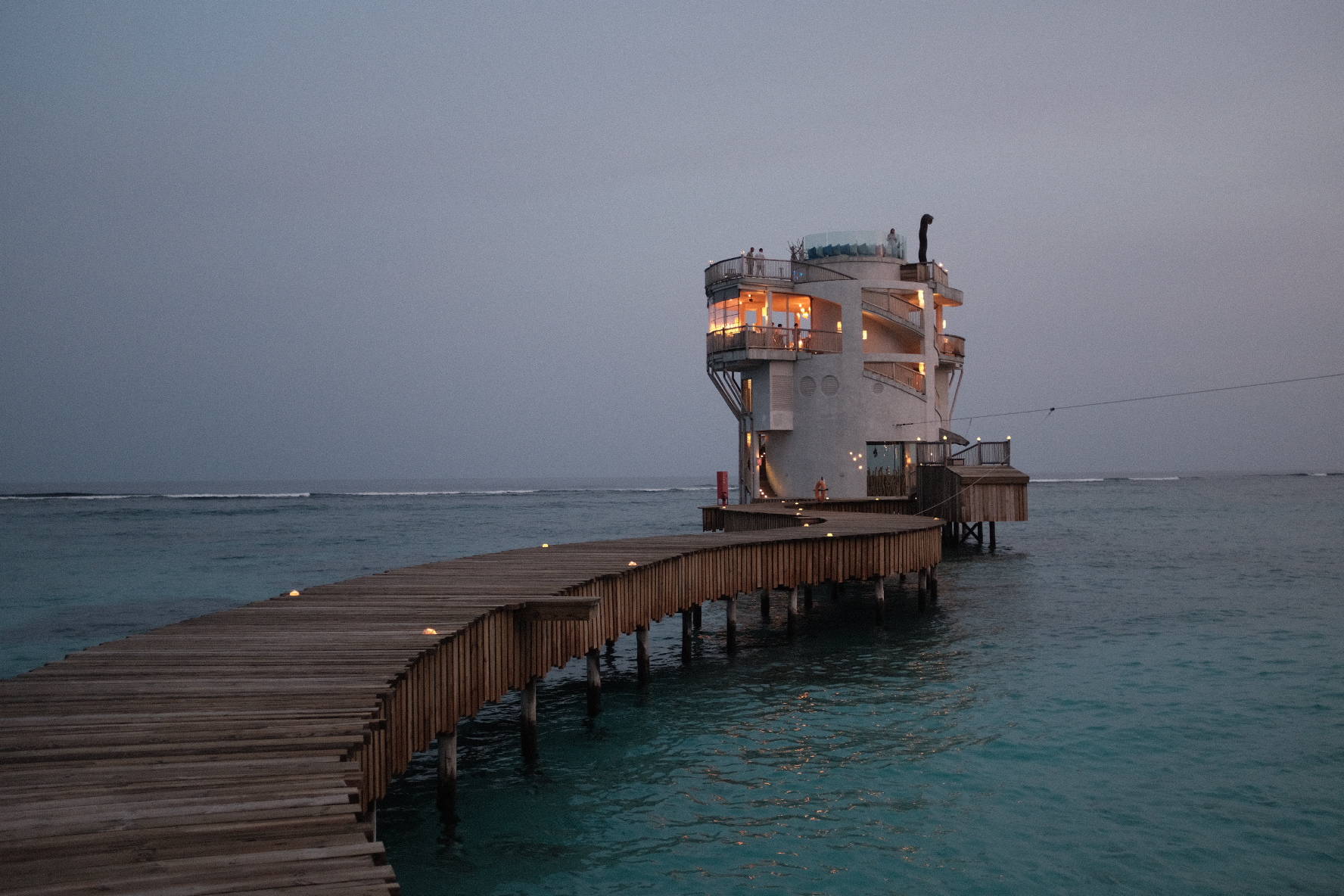 抵达酒店的第一顿晚餐是在正餐厅“Out of This World”吃的。据说客人可乘滑索抵达这个标志性的观景露台用餐塔,这里融合酒窖与天文台的建筑矗立于无垠海景与壮阔天幕之间。先在露天塔顶享受美酒和小食,接着服务员会引导你入席体验一餐板前无国界料理。