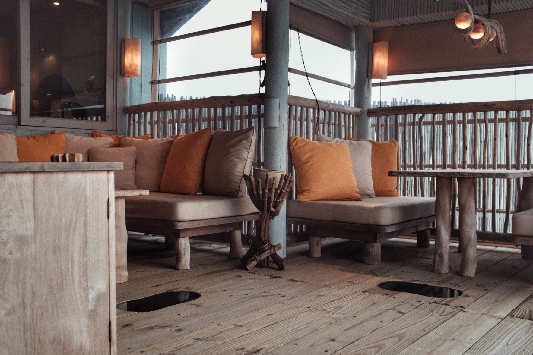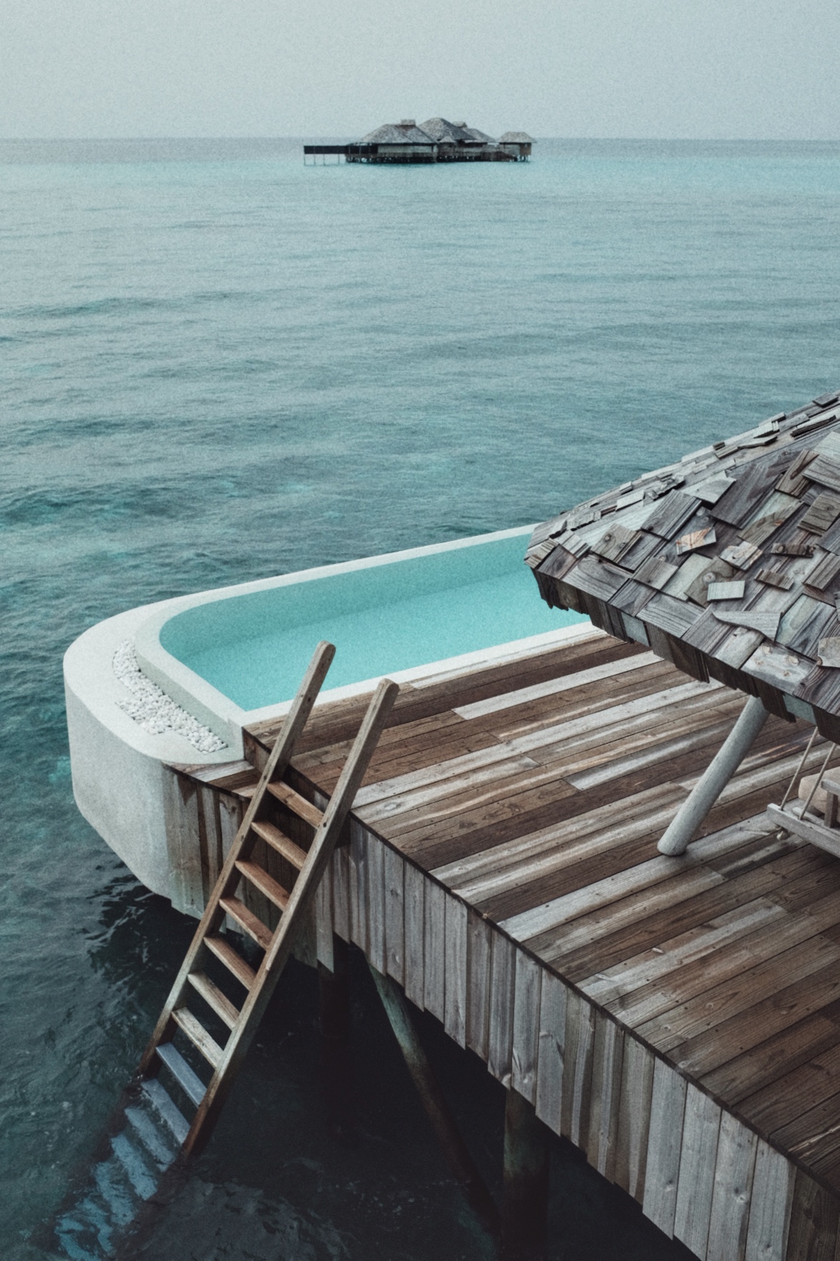 整岛的设计和选材都是Soneva自己的设计团队和建筑团队来完成,采取极简木构架,保留原木肌理与编织棕榈叶顶棚,大量使用透光布幔和不规则石材,几乎没有人为造景痕迹。酒店使用FSC认证的各类可持续木材打造,展现本身的张力,所有建筑在阳光下都呈现出灰白的原始感,与自然环境重叠相对。或许在岁月经年之后,这里又会有一种别样的色彩。