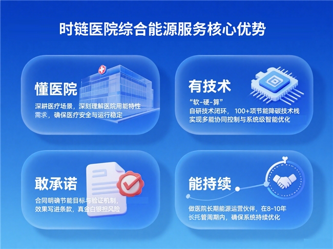 时链科技“零投资+能源托管”服务不仅帮助医院实现能耗成本降低与运营效率提升,更推动医疗资源向 “治病救人” 核心使命聚焦,为医疗行业能源管理模式创新提供了切实可行的路径。随着 “双碳” 战略与医疗改革的持续深化,将进一步成为医院优化运营结构、提升服务效能的重要支撑,为构建高效、安全、绿色的现代医疗服务体系贡献关键力量。