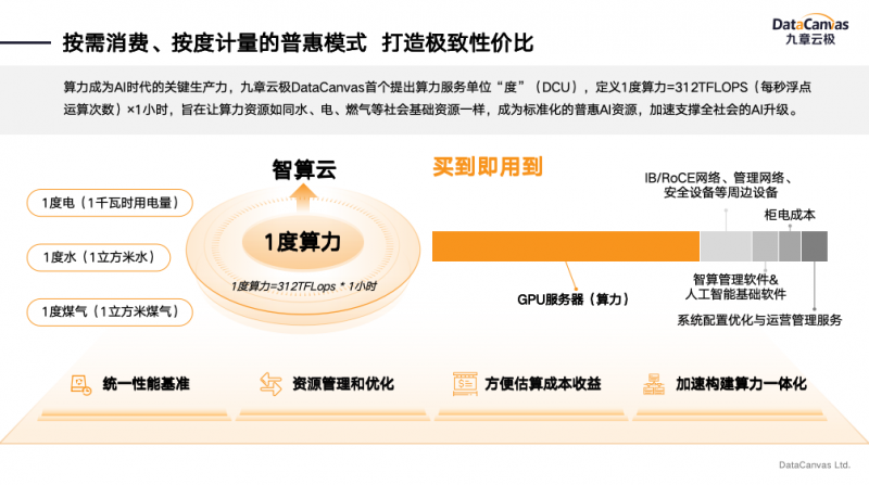 九章云极提出的普惠算力,核心是“按度计量、按需消费”模式,以九章智算云Alaya NeW Cloud 2.0为技术基座,通过虚拟化服务替代传统硬件堆砌,将算力转化为“度(DCU)”这一标准化计量单位,实现如电力计量般的高效流通,用户仅需为实际消耗的算力付费,大幅降低使用成本。