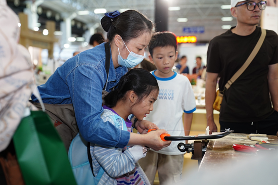 在这场成果展上,每个人都有机会“做个匠人”,亲手制作一把属于自己的梳子。没想到,参与体验的小朋友也络绎不绝,在木匠师傅的教学和协作下,他们挑选喜欢的木料,沉浸式体验画片、圆角、开齿、砂背、细磨等环节,然后发挥无限想象,在木梳上绘制出专属的图案,收获满满。