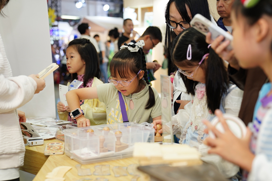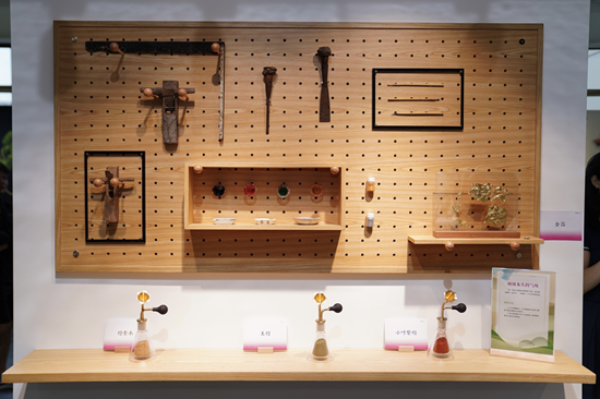除了动手制梳,闻香体验也备受欢迎。现场准备了装有玉檀、小叶紫檀、檀香木3种木材香气的闻香瓶,体验时,只需轻握闻香瓶,按压瓶身的硅胶气囊,香气便会缓缓释放。将瓶口轻轻凑至鼻尖约 5-10厘米处细嗅,就能清晰感受到不同木材香气的独特层次——玉檀香气清新雅致,小叶紫檀香气醇厚绵长,檀香木香气宁静悠远。在设置的打卡点,观展者可以“集邮”盖章,还能打卡领取定制冰箱贴、专属明信片以及充满自然气息的木纹明信片,留下这场成果展的专属记忆。