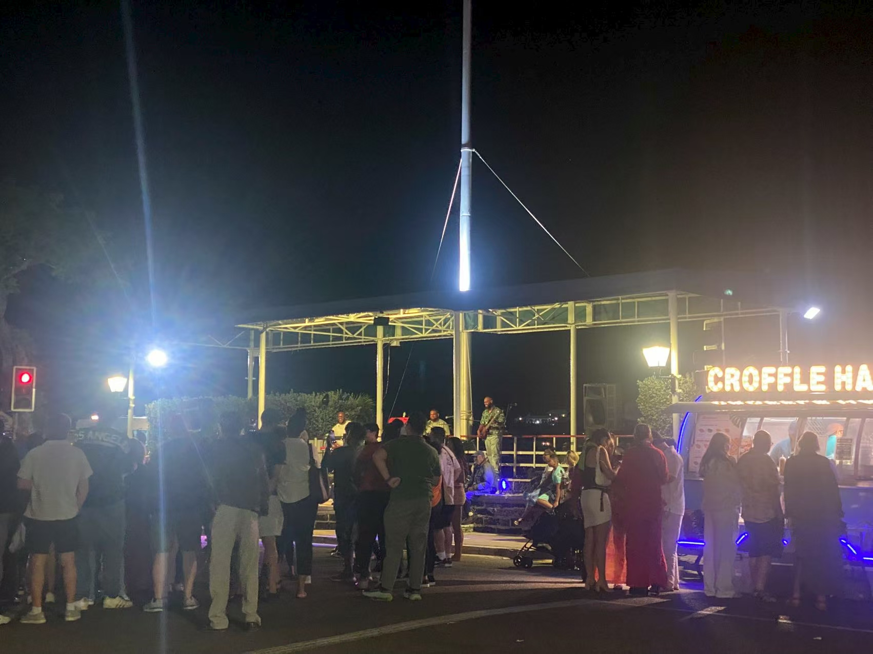 晚上,我与太阳去哈密顿街逛每周一次的集市。沿街都是小吃、小商品。海边搭了个露天舞台,台顶上飘扬着一面很大的百慕大国旗。旗帜的一半是英国国旗。四位黑人表演者边弹边唱。台下还有一群打击乐者,特别是那个鼓,敲得如急雨般响亮、明快。观众也跟着鼓声摆动起舞。这大概是我看到最具百慕大特色的文化了。