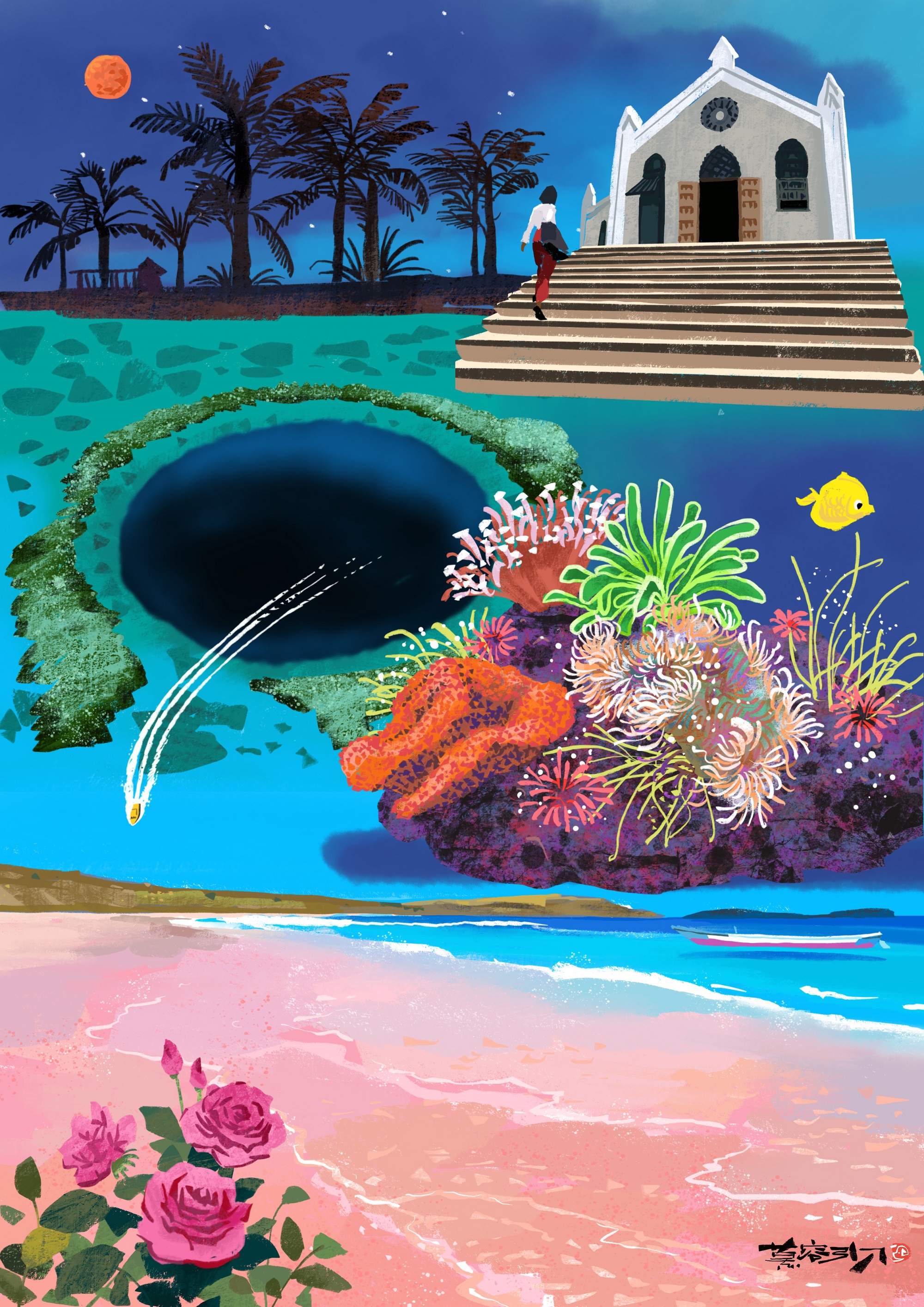下午去了酒店所属的一片私人海滩。月牙形的小海湾,远山晕晕。看到了粉红色沙滩、纹丝不动的海螺。
