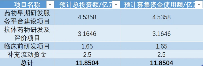 据科创板招股书,本次百奥赛图拟募资11.85亿元,用于药物早期研发服务平台建设项目、抗体药物研发及评价项目、临床前研发项目和补充流动资金。