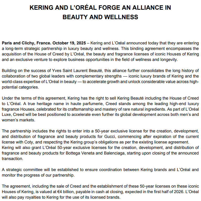 根据协议,欧莱雅收购开云集团旗下美妆业务,包括香水品牌Creed的完全所有权,以及古驰、葆蝶家、巴黎世家等奢侈品牌长达50年的美妆香水授权。同时双方将成立独家合资公司共同探索健康与长寿科学领域的商业机遇。