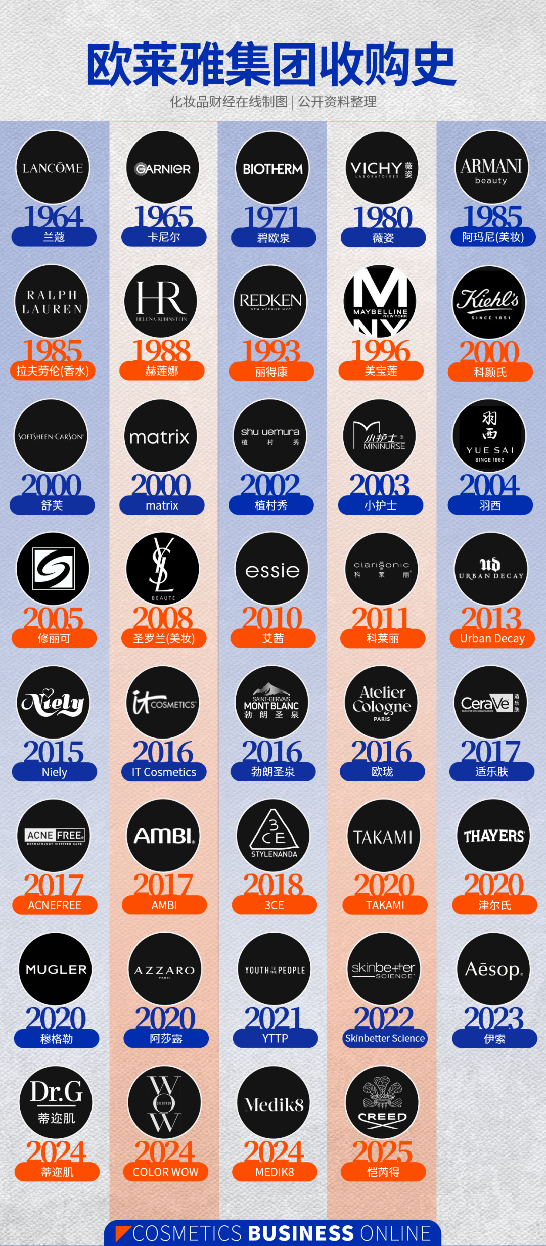 回顾欧莱雅的发展史,并购贯穿主线。据CBO不完全统计,自60年前收购兰蔻以来,欧莱雅已累计收购近50个品牌,平均每14个月完成一次收购。