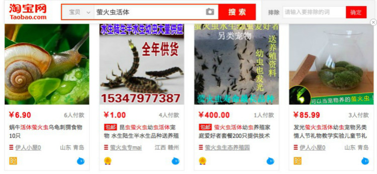 因此,淘宝网决定将野生活体萤火虫纳入禁售商品管理范围,“2017年5月24日起,淘宝将对野生活体萤火虫相关商品信息执行排查与清理措施。”