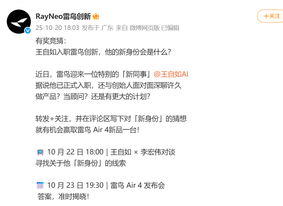 10月20日,@雷鸟创新 发文官宣王自如入职。具体职务将在10月23日雷鸟Air 4发布会公布。