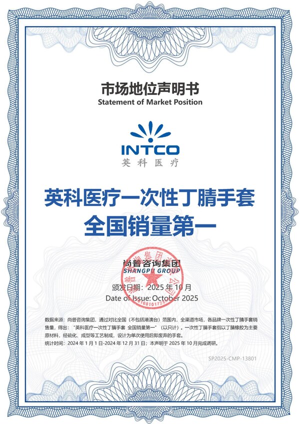 近日,英科医疗(300677.SZ)宣布获得知名市场研究机构尚普咨询集团颁发的 "一次性手套全国销量第一"和"一次性丁腈手套全国销量第一"市场地位声明书,全面印证了在国内一次性手套市场的领先地位。