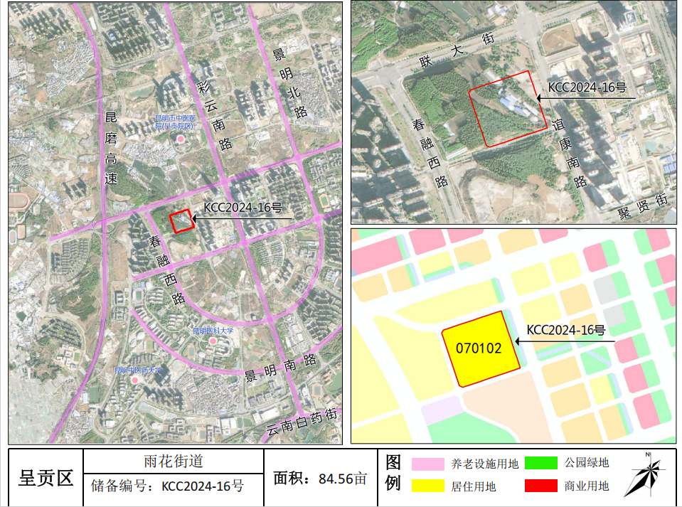 该编号为KCC2024-16号城镇住宅用地,位于呈贡区雨花街道,紧挨中通联大书山项目,约84.5亩,容积率仅2.1,起拍价约2.25亿,起始楼面价约1900元/㎡。