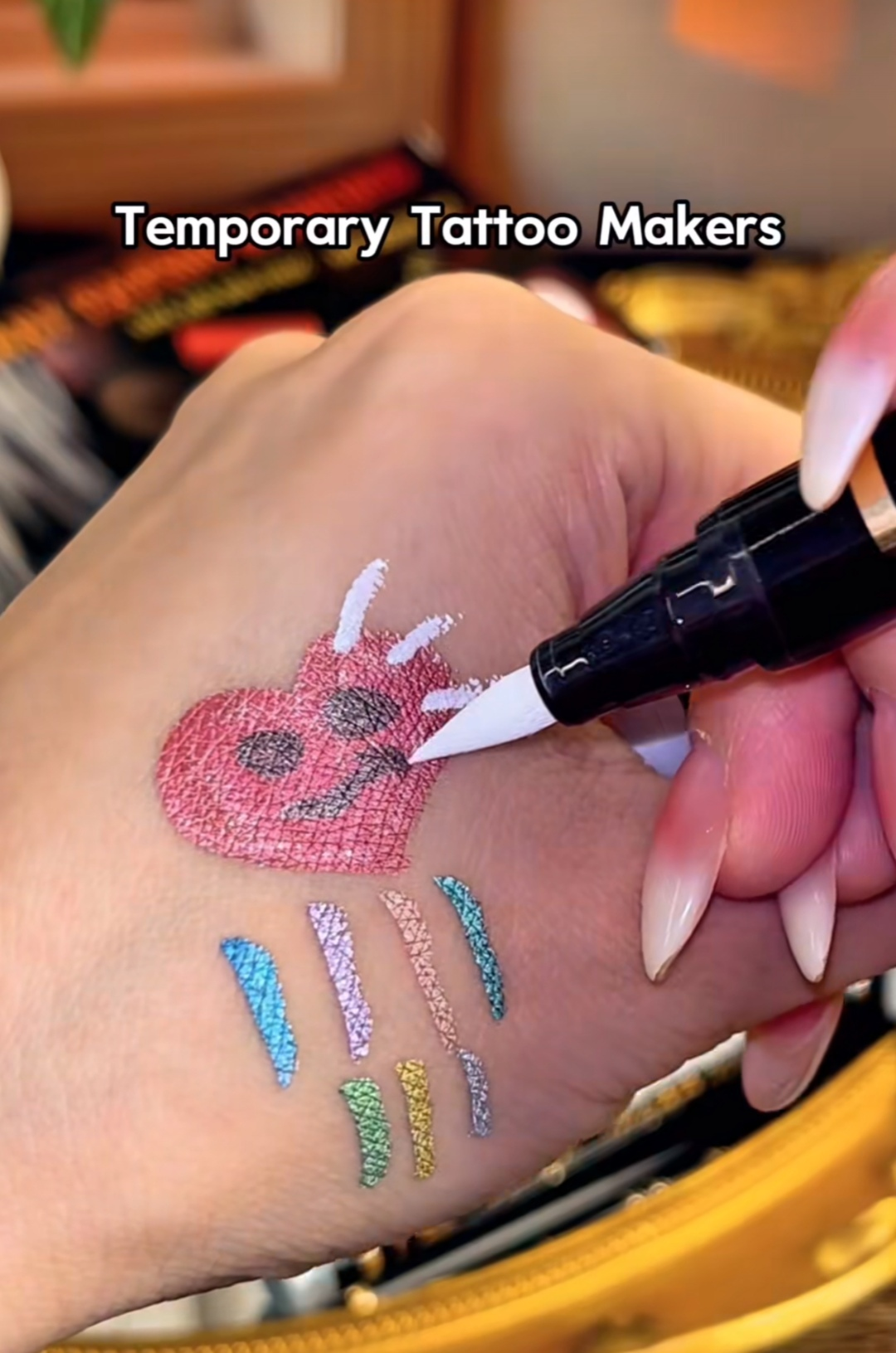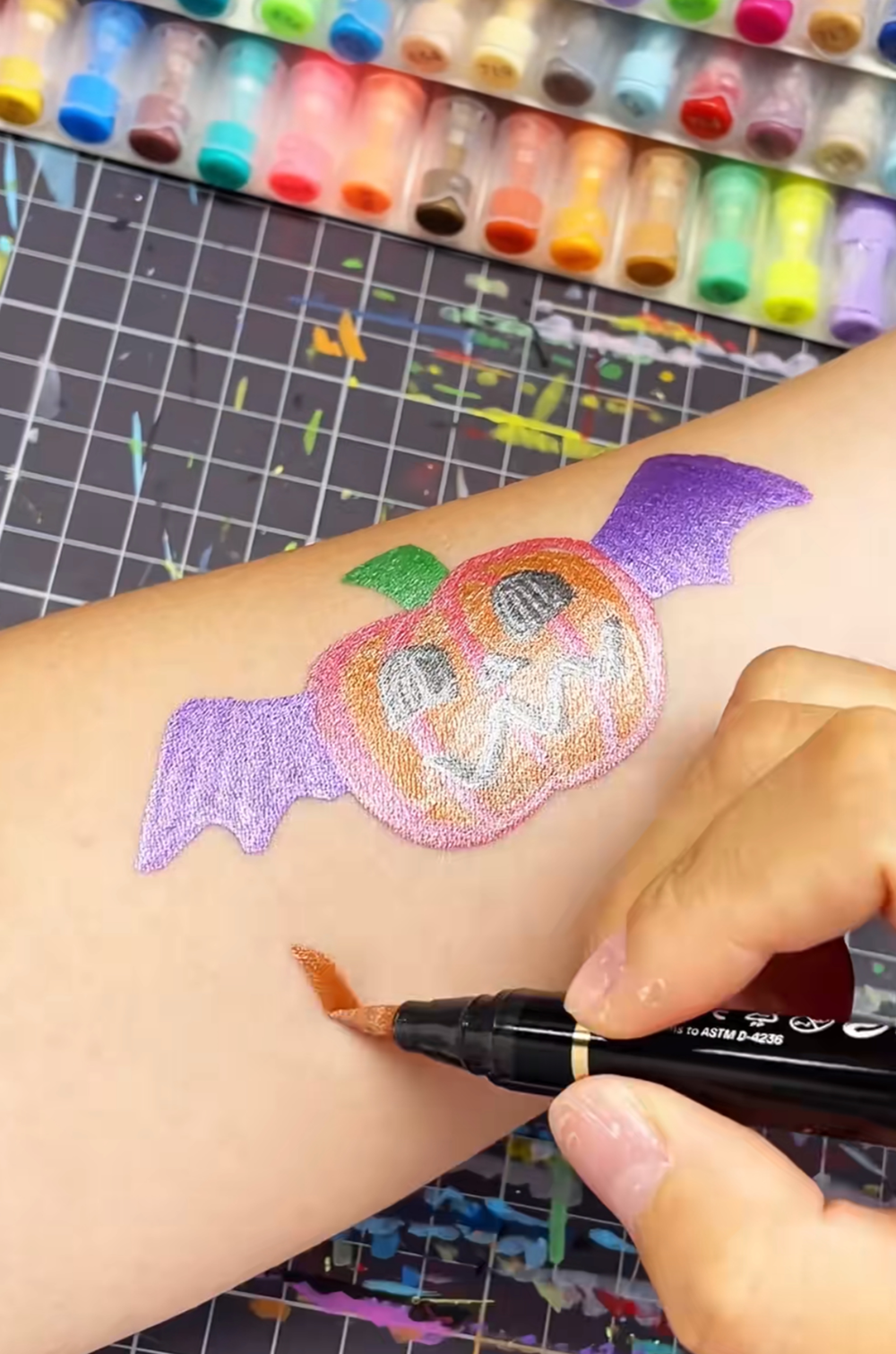 伴随笔尖的荧光色调流动,趣味南瓜图案渐渐在手臂上成型——这不是文身,而是用丙烯马克笔绘制的节庆装饰画。这条展示“文身笔”神奇效果的短视频,在TikTok上收获了超过600万次播放,让这款马克笔在20天内冲上TikTok Shop文具类目销量榜前列。