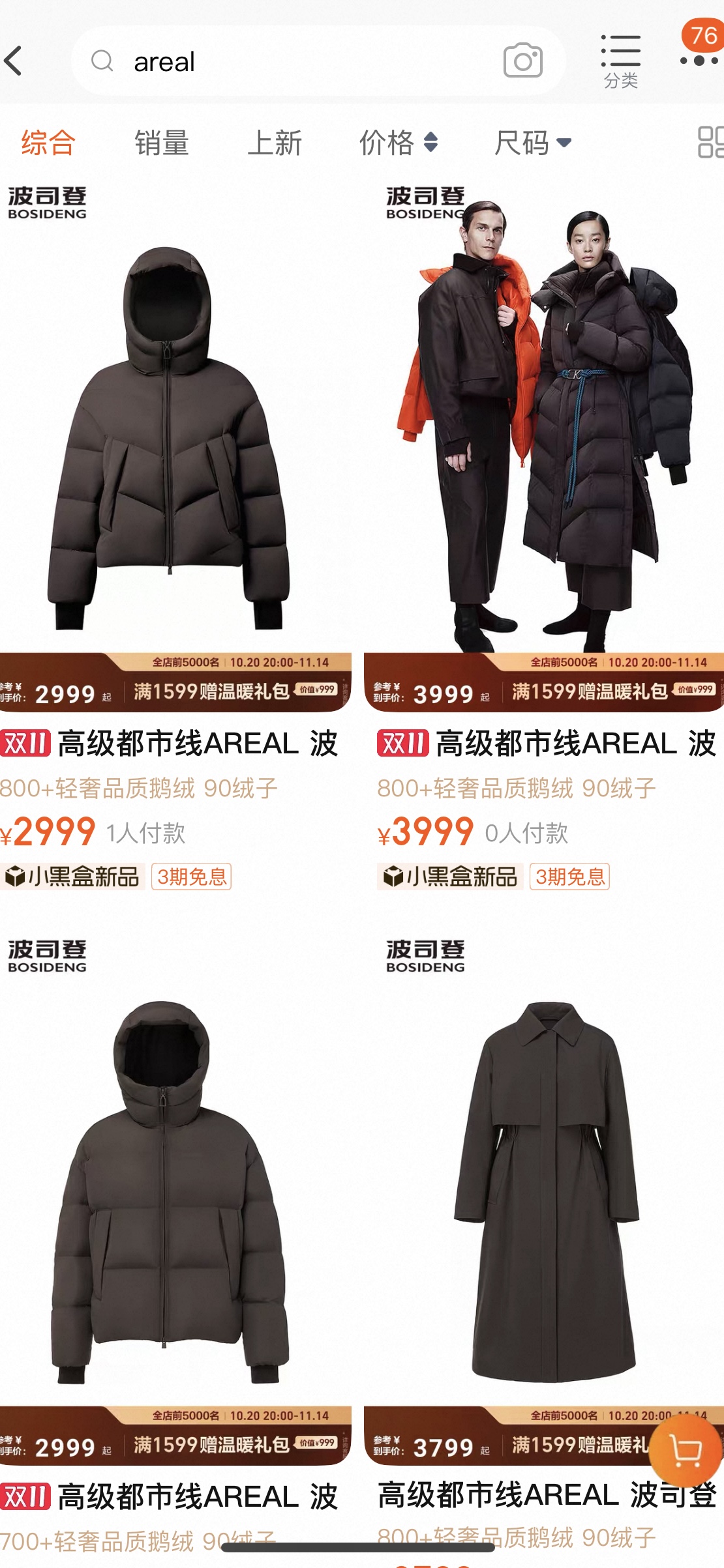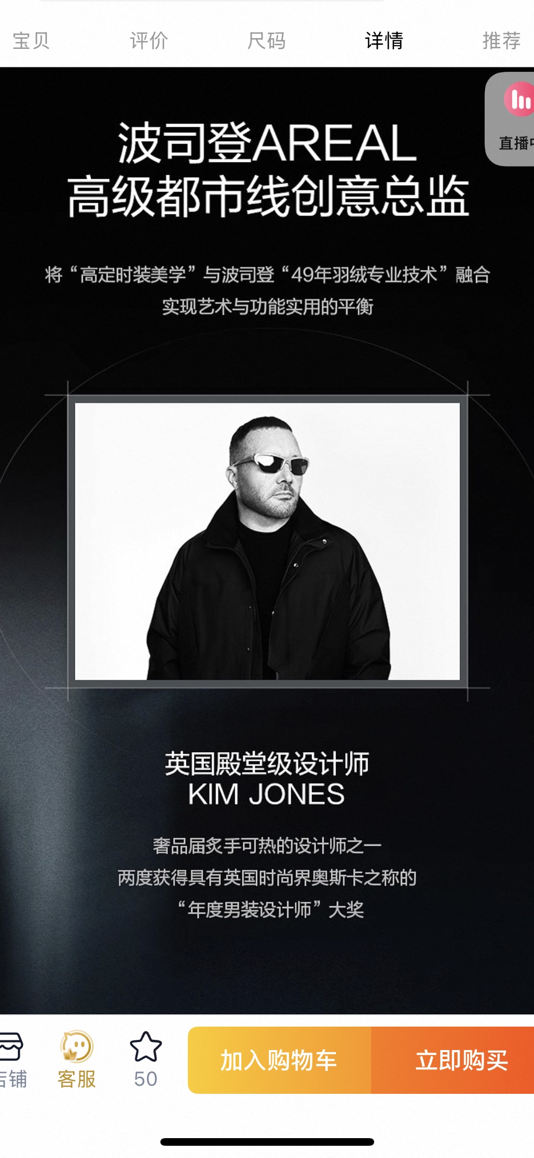 界面时尚在波司登天猫旗舰店看到,其已上线的AREAL高级都市系列定价区间为2399元至3999元,主打“800+蓬松度”“90鹅绒”“高定版型”三大卖点,并在详情页配上Kim Jones的照片与介绍,以强化“奢品级高定版型”的定位。