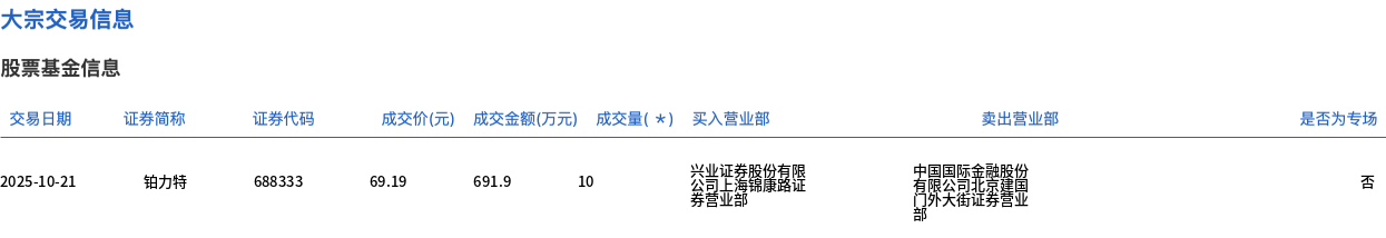 10月21日,铂力特大宗交易成交10万股,成交额691.9万元,占当日总成交额的2.06%,成交价69.19元,较市场收盘价69.19元持平。