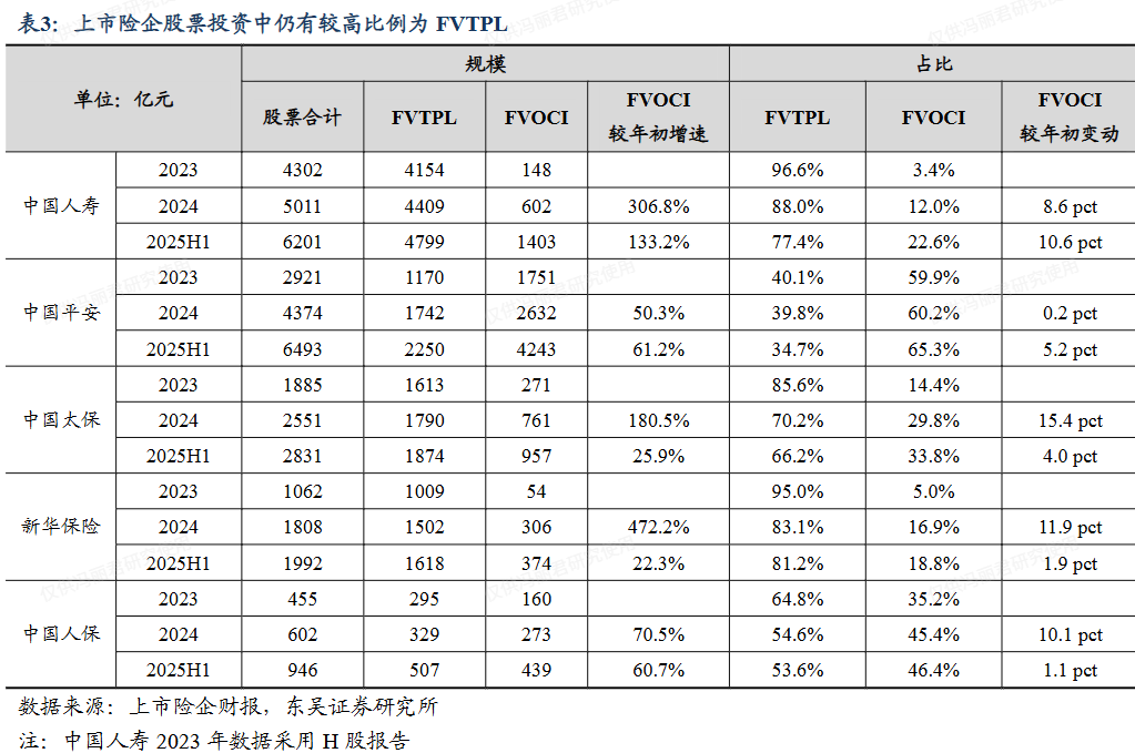 根据东吴证券数据,2025上半年五家A股上市险企股票归入FVTPL的占比中,新华保险(81.2%)、中国人寿(77.4%)最高,中国太保(66.2%)、中国人保(53.6%)均超过五成,中国平安(34.7%)不到四成。