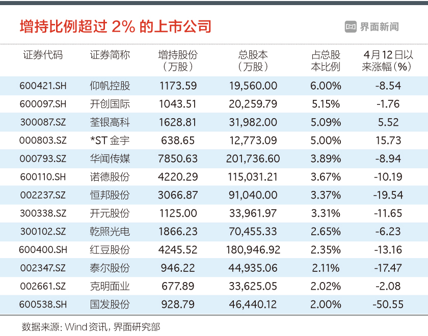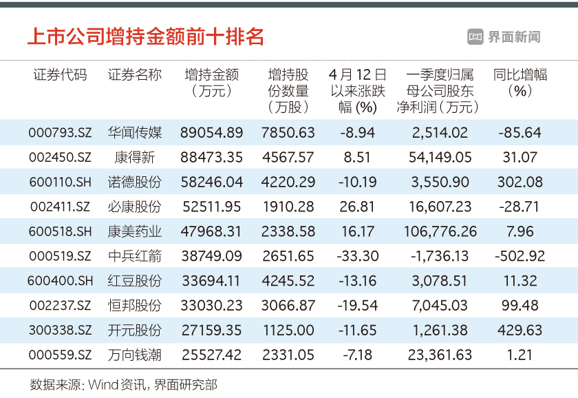 具体到各家公司来看,华闻传媒(000793.SZ)以8.91亿元排在增持金额的第一名,康得新(002450.SZ)以及诺德股份(600110.SH)紧随其后,增持金额分别为8.85亿元和5.82亿元。前十名中的第十名万向钱潮(000559.SZ)也超过了2.5亿元。