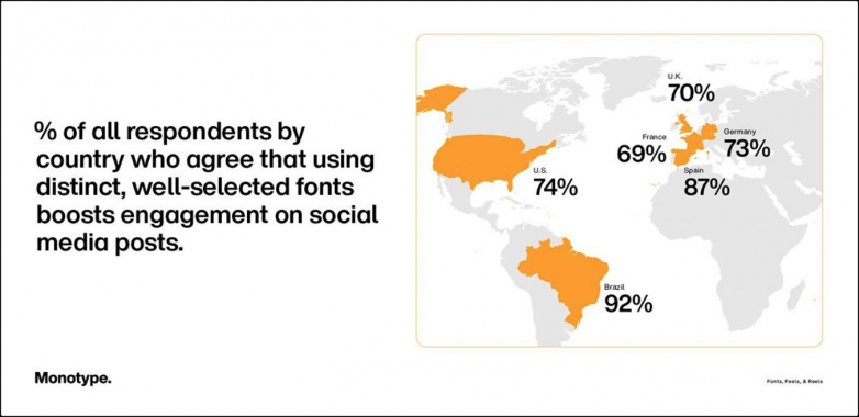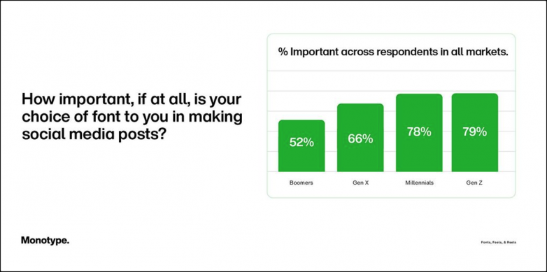 研究显示,各世代普遍认同字体的价值,近 70% 的社交媒体用户认为字体选择对于发布帖文十分重要。这种看法在年轻的数字原生世代中更为强烈:79% 的 Z 世代与 78% 的千禧世代同意字体是发布帖文的关键要素。
