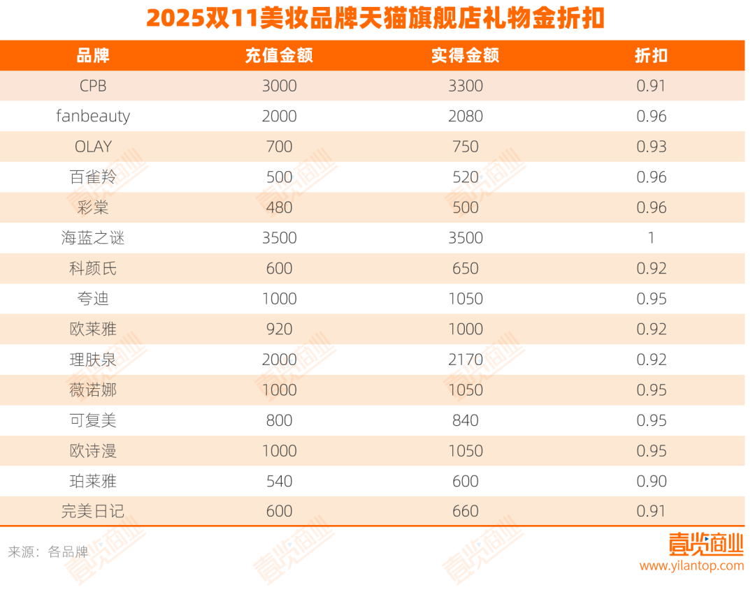 礼物金也是衡量各品牌双11折扣的另一标准。据壹览商业统计,今年天猫旗舰店的美妆礼物金折扣普遍集中在0.90—0.96区间。珀莱雅今年力度最大,打出九折礼物金;而海蓝之谜仍然“无折”,3500充3500,延续一贯的价格自信。