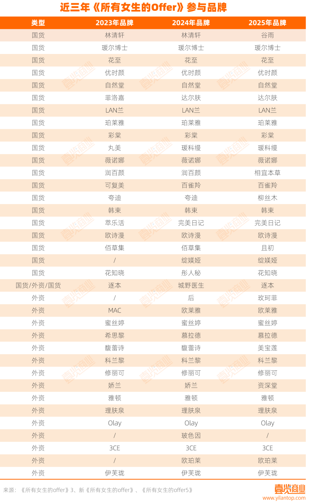 再看国货阵容。连续三年都出现在《所有女生的OFFER》中的国货美妆共有十余个,包括珀莱雅、薇诺娜、韩束、欧诗漫、优时颜、彩棠、自然堂、瑷尔博士等。