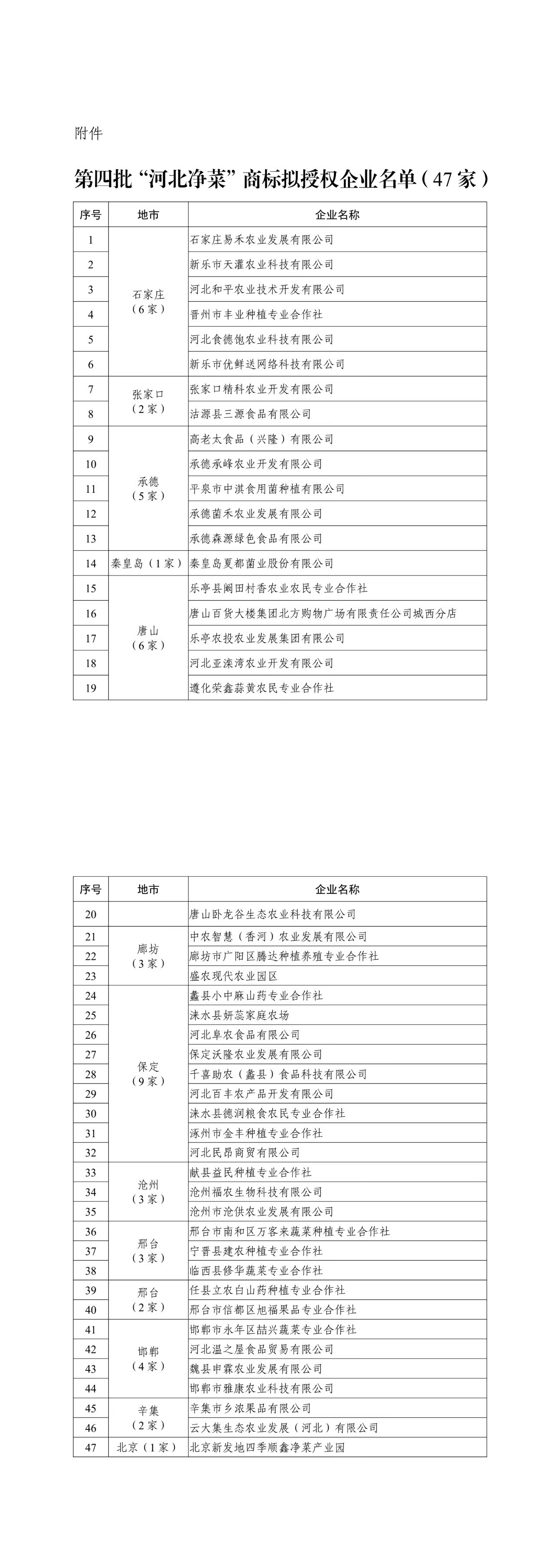 据了解,河北省商务厅根据“河北净菜”进京入津工作安排部署和《“河北净菜”品牌使用管理规范(试行)》要求,经企业申请、各地推荐、专家评审、征求意见,评选出了47家“河北净菜”商标拟授权企业,并予以公示(详见下表)。公示期为2025年10月22日至24日(3天)。