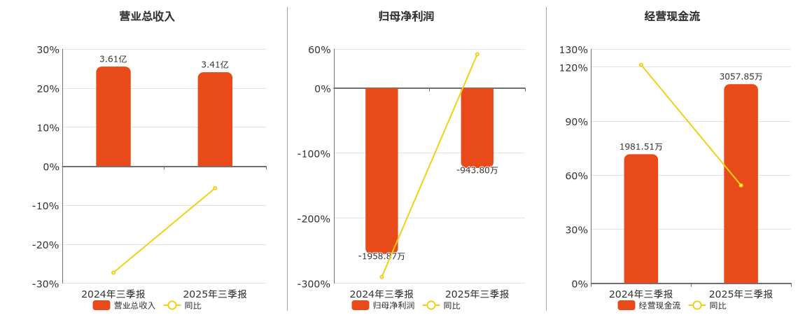 公司营业总收入为3.41亿元。归母净利润为-943.80万元,较去年同报告期归母净利润增加1015.06万元。经营活动现金净流入为3057.85万元,较去年同报告期经营活动现金净流入增加1076.33万元,实现2年连续上涨,同比较去年同期上涨54.32%。