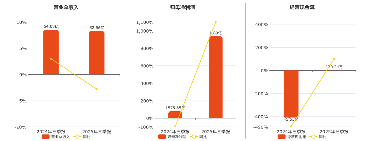 公司营业总收入为52.56亿元,较去年同报告期营业总收入减少1.52亿元,同比较去年同期下降2.82%。归母净利润为1.89亿元。经营活动现金净流入为170.24万元。