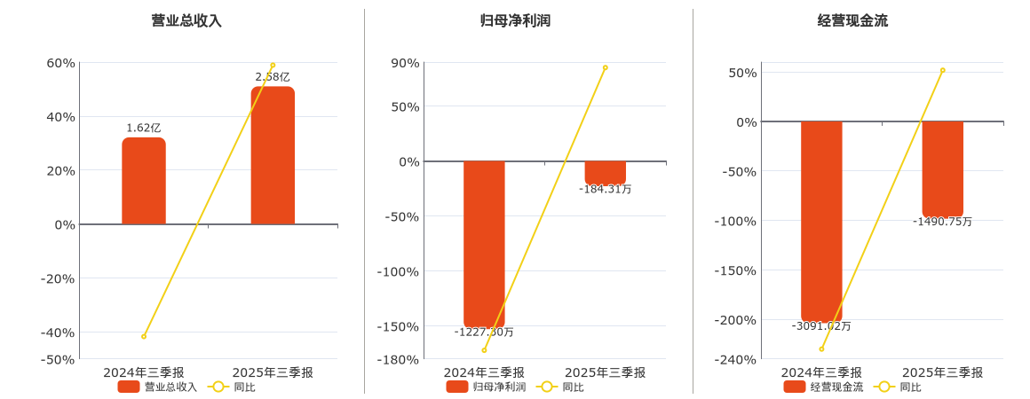 公司营业总收入为2.58亿元,较去年同报告期营业总收入增加9548.76万元,同比较去年同期上涨58.86%。归母净利润为-184.31万元,较去年同报告期归母净利润增加1043.00万元。经营活动现金净流入为-1490.75万元,较去年同报告期经营活动现金净流入增加1600.27万元。