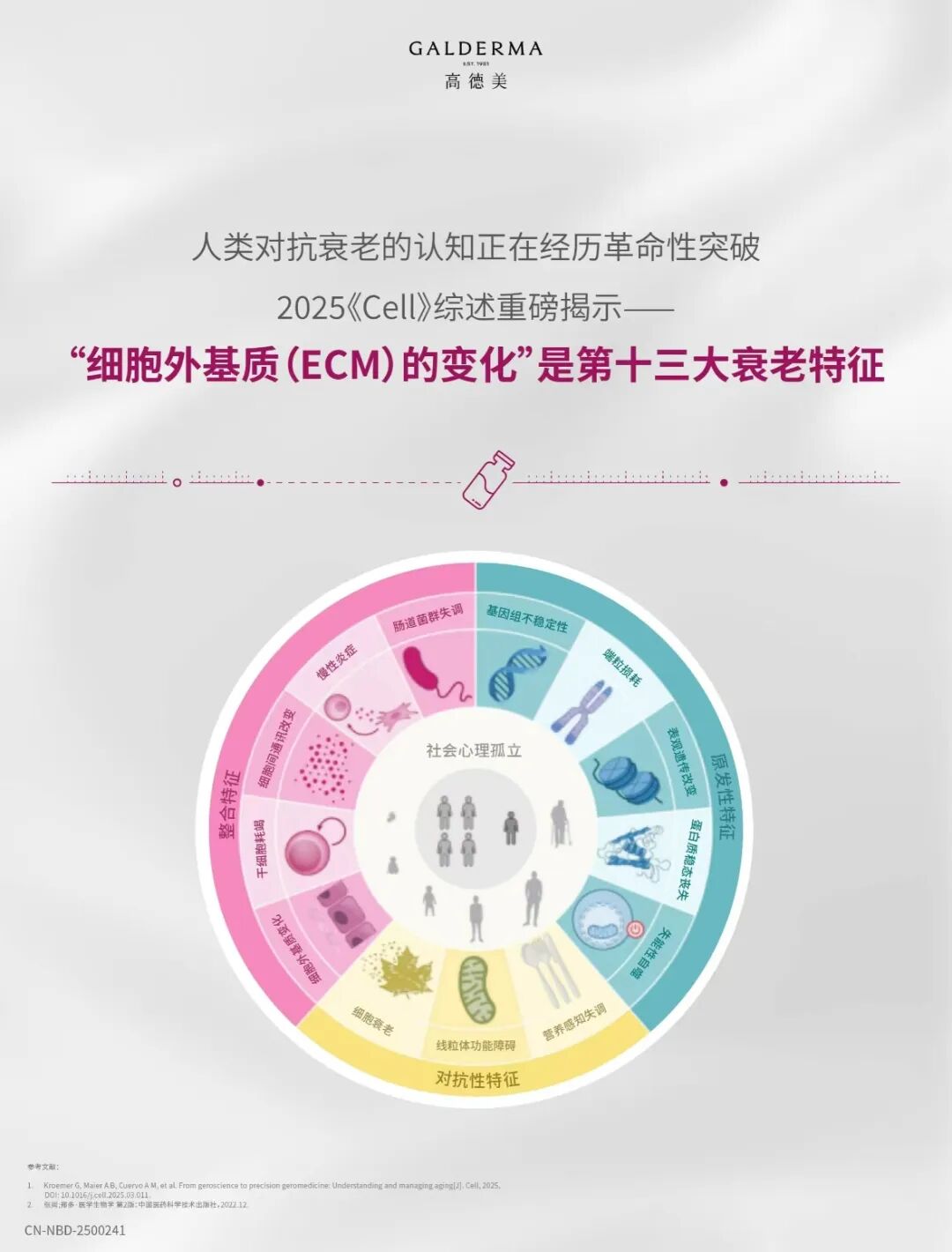 被《Cell》期刊列为第十三大衰老标志的ECM(细胞外基质),既是支撑细胞生长的力学支架,也是传递信号的信息枢纽,皮肤衰老的本质,正是ECM微环境失衡。
