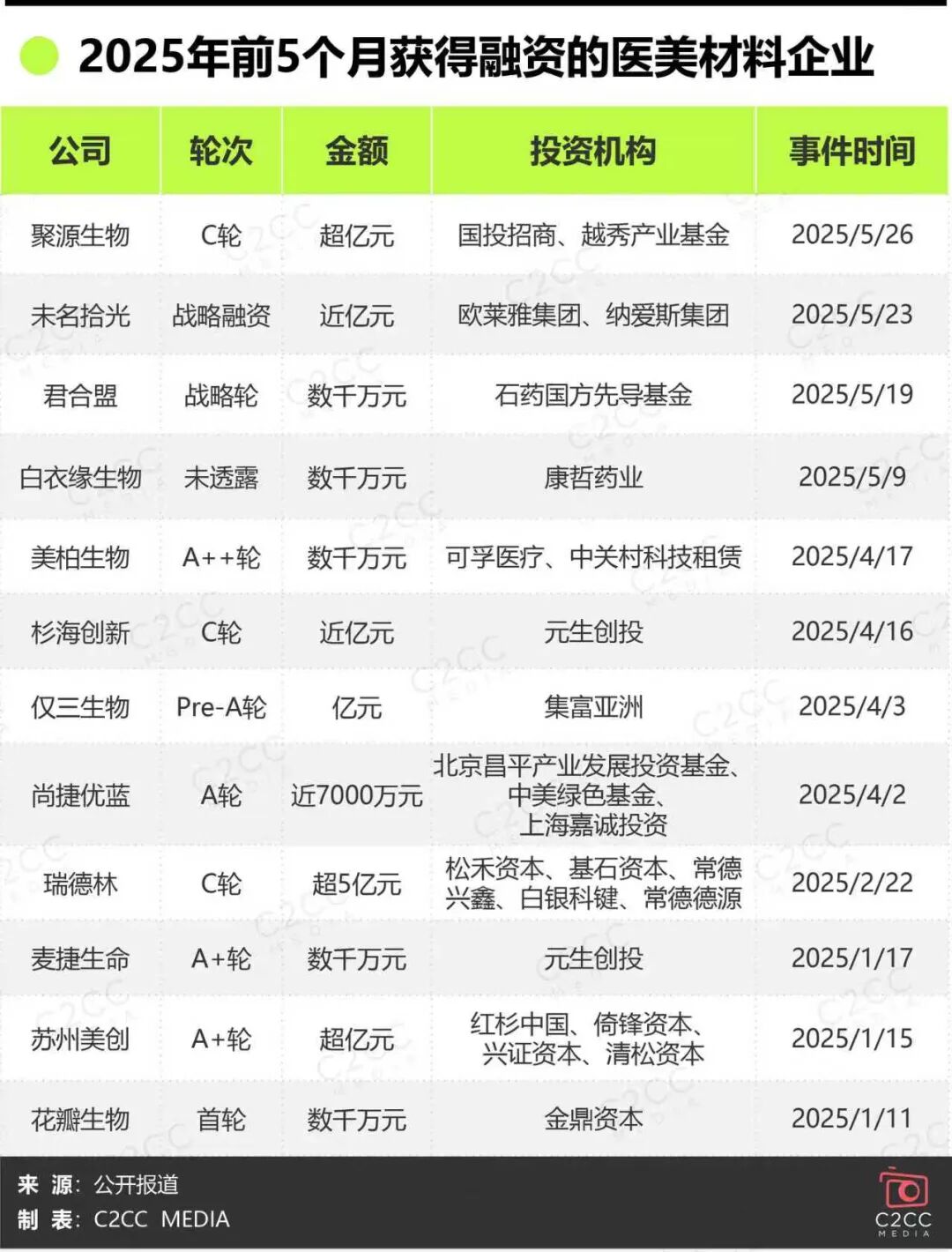 这一点也得到资本与企业的密集印证,2025年前5个月,国内已有12家医美新材料企业获得融资,注射填充、功能护肤材料成为核心融资赛道。而近期,国内医美上游领域再添融资动态,头部企业美尚洁生物与维纳丝医疗相继完成新一轮融资,其核心产品分别聚焦重组胶原蛋白与丝素蛋白两大前沿方向。