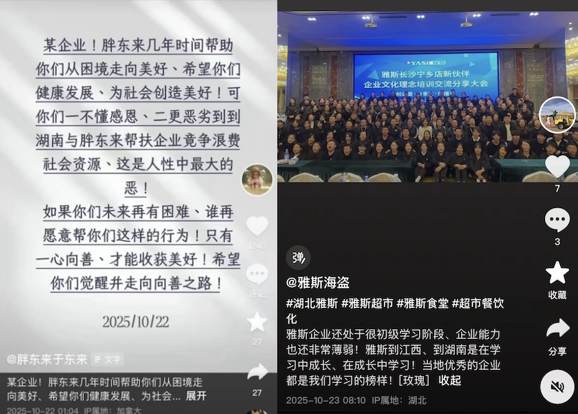 在于东来似乎成为中国零售行业“教父”一般的存在以前,湖北雅斯就已是胖东来的学徒。湖北雅斯公众号自2015年起多次发布“东来授慧雅斯”等内容,杜晓宜本人还接受过胖东来网络影视中心的专访,到今年6月还在社交平台上发布对于东来、胖东来的学习笔记。