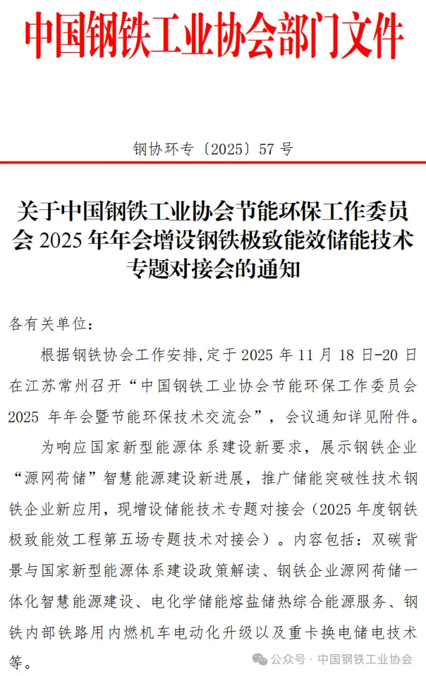 10月23日,据中国钢铁工业协会消息,中国钢铁工业协会节能环保工作委员会2025年年会增设钢铁极致能效储能技术专题对接会。根据钢铁协会工作安排,定于2025年11月18日-20日在江苏常州召开“中国钢铁工业协会节能环保工作委员会2025年年会暨节能环保技术交流会”。