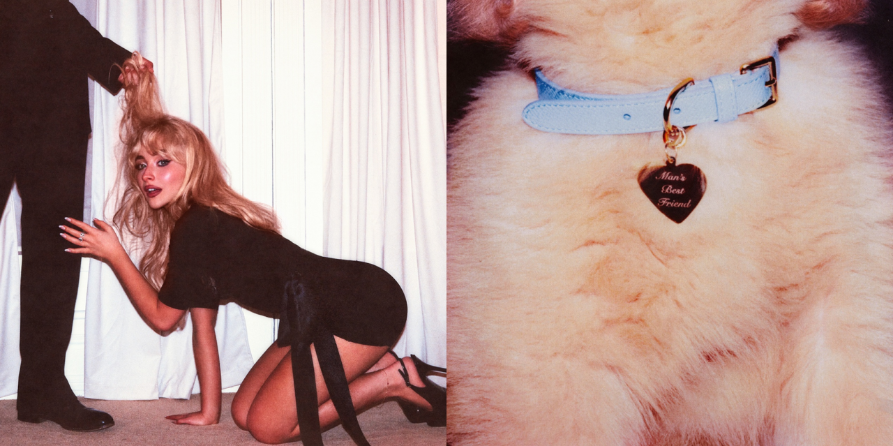 无独有偶。一个月前,另一位美国流行女歌手萨布丽娜·卡彭特(Sabrina Carpenter)发布的新专辑Man’s Best Friend引发了相似的争议。批评大部分集中在专辑封面:画面中,卡彭特跪在一个西装男人面前,对方拽着她的头发;另一张视觉图片则是狗戴项圈的特写,上面写有专辑名称。结合两张图片的联想,人们将主题理解为“男人最好的朋友”,并以此指责卡彭特在迎合男性凝视。