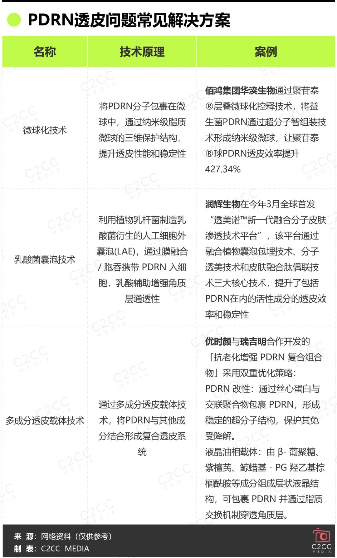 然而,解决原料供给问题只是第一步。对于涂抹式产品而言,PDRN作为大分子成分,能否穿透皮肤角质层、直达作用靶点并保持活性,直接决定了产品的实际功效与商业化竞争力。这一核心痛点,也推动行业探索出多种针对性的技术解决方案。