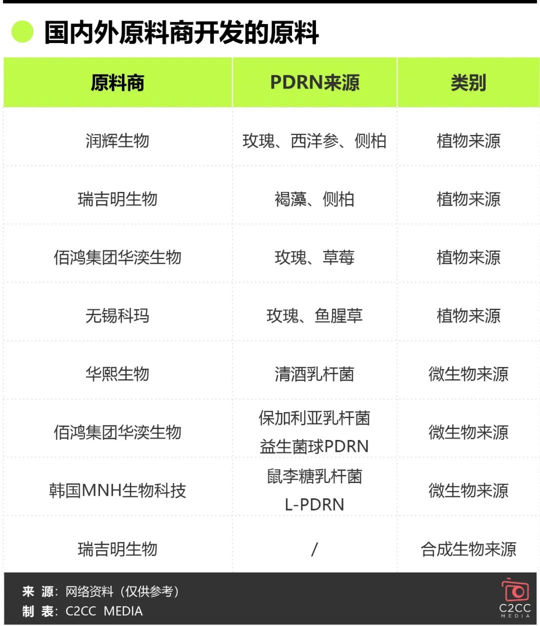 植物来源方面,润辉生物从玫瑰、西洋参、侧柏中提取PDRN,瑞吉明生物聚焦褐藻与侧柏,佰鸿集团华湙生物、无锡科玛则分别以玫瑰为核心原料。