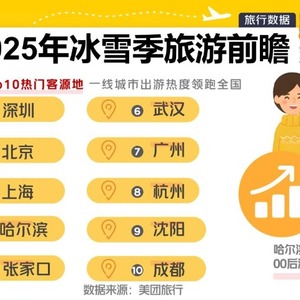 冬季冰雪项目的关注度持续飙升。今年10月中旬以来,“室外滑雪场”搜索量同比上涨近900%,深圳、北京、上海、哈尔滨、张家口、武汉、广州、杭州、沈阳、成都为冰雪游Top10客源地城市,一线城市游客冰雪季出行热度领跑全国。一张雪票,对周边餐饮、住宿等服务消费拉动作用明显。