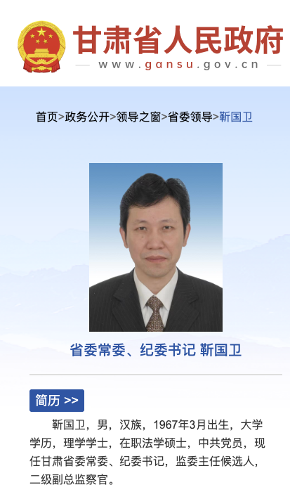 甘肃省政府网站“领导之窗”信息更新显示,靳国卫已任甘肃省委常委、纪委书记,监委主任候选人,二级副总监察官。