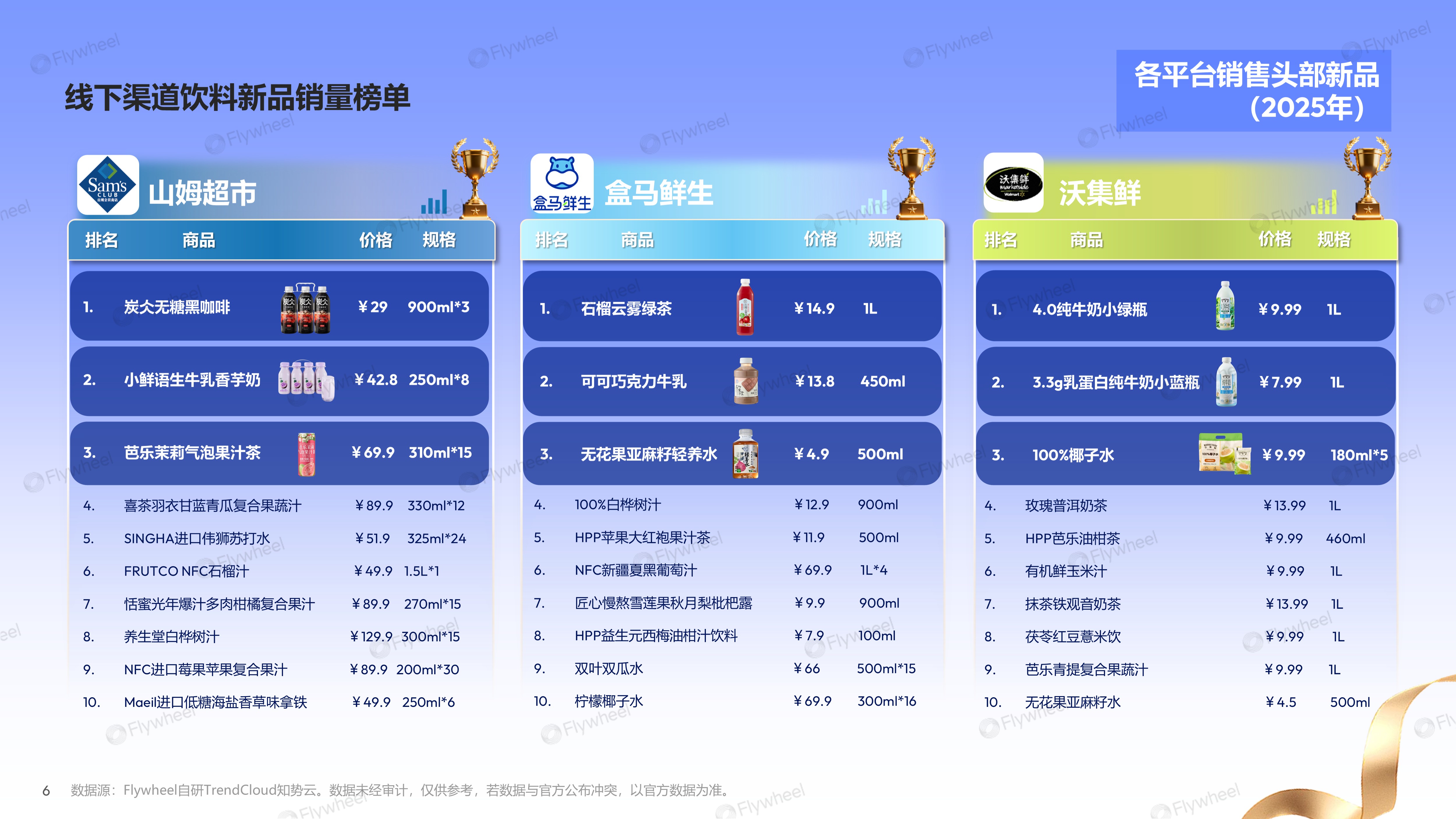 我们总结了2025年山姆、盒马、沃集鲜三大零售渠道的饮料新品销售榜单与社媒声量榜单,可以清晰观察到当前线下饮料市场的消费偏好与品类趋势正呈现出健康化、功能化与场景细分的显著特征。