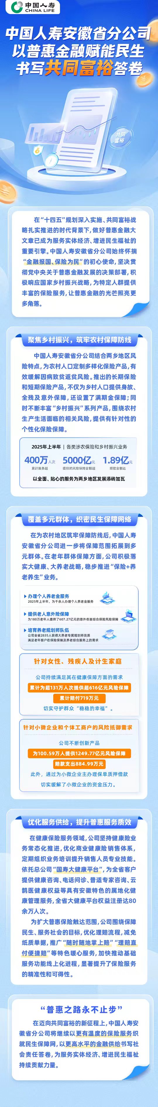 在“十四五”规划深入实施、共同富裕战略扎实推进的时代背景下,做好普惠金融大文章已成为服务实体经济、增进民生福祉的重要引擎。中国人寿安徽省分公司始终怀揣“金融报国、保险为民”的初心使命,坚决贯彻党中央关于普惠金融发展的决策部署,积极响应国家乡村振兴战略,为特定人群提供丰富的保险服务,让普惠金融的光芒照亮更多角落。