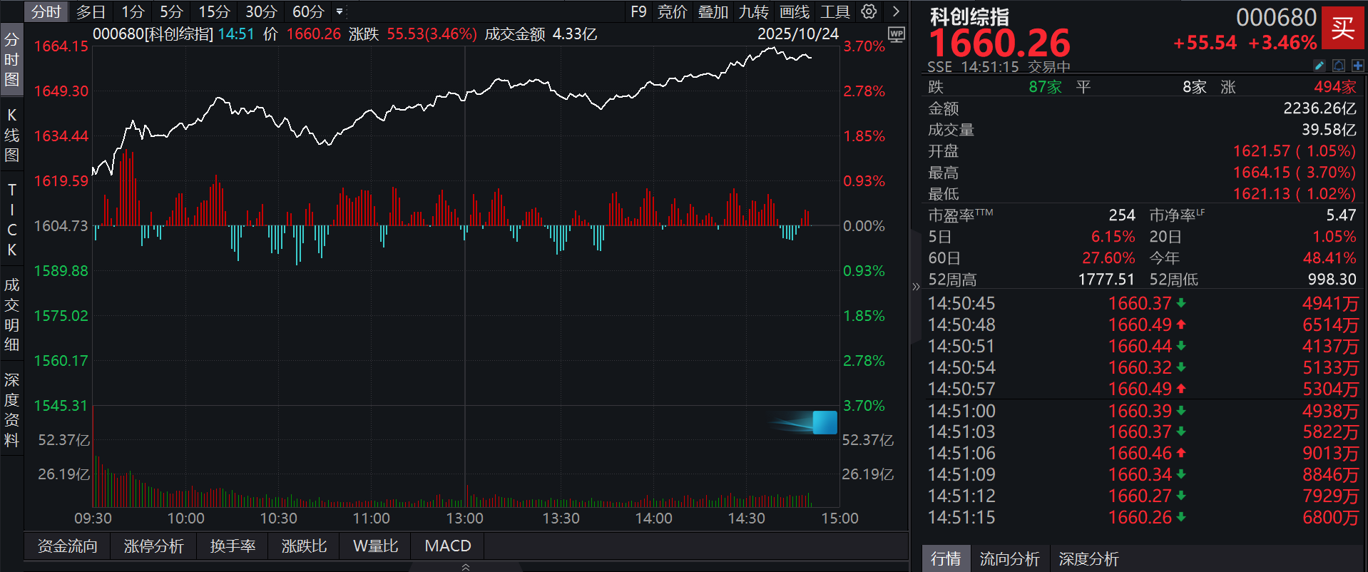 截至2025年10月24日 14:51,科创综指(000680)强势上涨3.46%,成分股普冉股份(688766)上涨20.00%,生益电子(688183)上涨19.99%,神工股份(688233)上涨17.18%,恒烁股份(688416),佳华科技(688051)等个股跟涨。