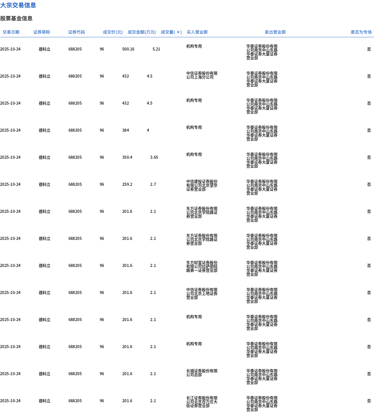 10月24日,德科立大宗交易成交41.36万股,成交额3970.56万元,占当日总成交额的4.31%,成交价96元,较市场收盘价109.59元折价12.4%。