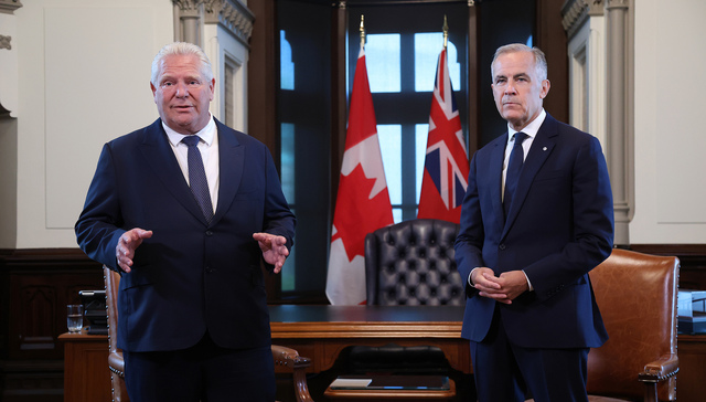 2025年8月18日,加拿大安大略省渥太华,加拿大总理卡尼(右)与安大略省省长福特在议会山举行会晤前。来源:视觉中国