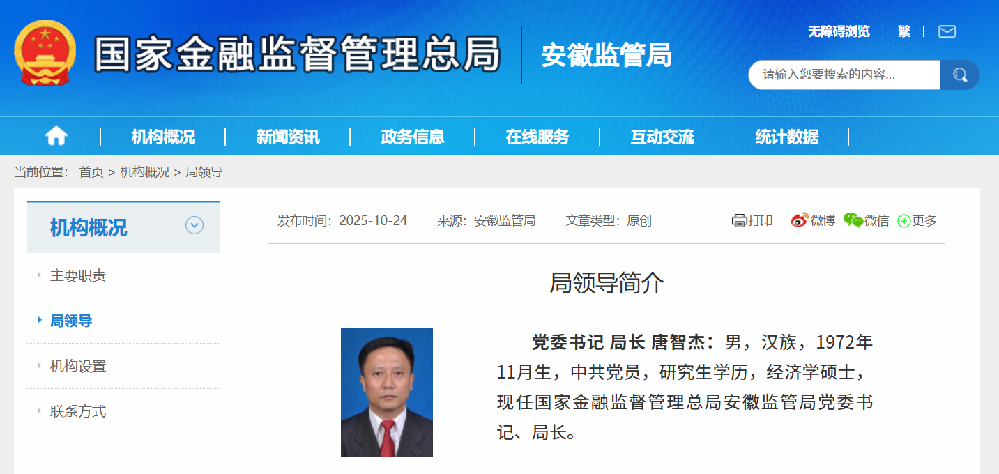 据10月24日安徽金融监管局官网信息,唐智杰已出任安徽金融监管局党委书记、局长。